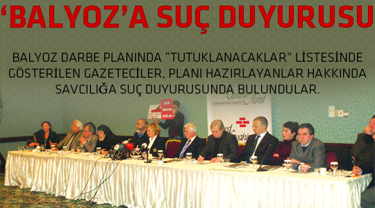 ‘’Balyoz” darbe planına ilişkin iddialar kapsamında ‘’tutuklanacaklar’’ listesinde yer aldığı ileri sürülen gazeteciler İstanbul Cumhuriyet Savcılığı’na suç duyurusunda bulundu. Savcılığa başvuran 27 gazetecinin isimleri şöyle: Kâzım Güleçyüz, Nazlı Ilıcak, Mehmet Altan, Abdurrahman Dilipak, Ahmet Taşgetiren, Ali İhsan Karahasanoğlu, Cengiz Çandar, Ekrem Dumanlı, Hasan Celal Güzel, Hidayet Karaca, Hüseyin Gülerce, Mustafa Karaalioğlu, Perihan Mağden, Akif Emre, Hasan Karakaya, Mehmet Ocaktan, Nuh Gönültaş, Sibel Eraslan, Sadık Albayrak, Yavuz Bahadıroğlu, Emre Aköz, Serdar Arseven, Mustafa Erdoğan, Etyen Mahçupyan, Gülay Göktürk, Ali Bayramoğlu, Murat Belge. |