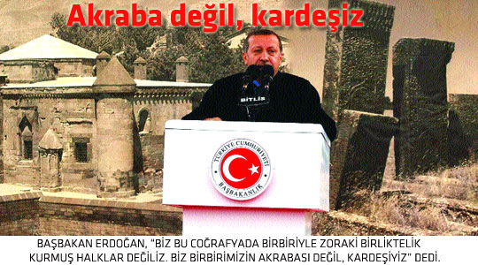 Başbakan Recep Tayyip Erdoğan, inkârın Türkiye’yi hiçbir yere taşımayacağına belirterek, “İnkâr, kardeşliğimizi pekiştirmez, bölgenin dertlerine derman üretmez, bölgenin sorunlarını çözmez” dedi. Terörün sadece devlet eliyle çözülemeyeceğine dikkati çeken Başbakan, herkesin çözüme katkısını istedi. AYRILAMAYIZ; ETLE TIRNAK GİBİYİZ Erdoğan, şöyle konuştu: “Biz bu coğrafyada birbiriyle 50-100 yıl önce tanışmış insanlar değiliz. Biz bu coğrafyada bin yıldır varız, bin yıldır biriz ve bin yıldır beraberiz ve etle tırnağız, biz birbirimizin akrabası değil, birbirimizin kardeşiyiz. Bu birlikteliği bozmaya kimsenin gücü yetmez.’’ BAŞBAKAN Recep Tayyip Erdoğan, “Biz bu coğrafyada birbiriyle 50-100 yıl önce tanışmış insanlar değiliz. Biz bu coğrafyada birbiriyle zoraki birliktelik kurmuş halklar değiliz. Biz bu coğrafyada bin yıldır varız, bin yıldır biriz ve bin yıldır beraberiz ve etle tırnağız, biz birbirimizin akrabası değil, birbirimizin kardeşiyiz. Bu birlikteliği bozmaya kimsenin gücü yetmez” dedi. Erdoğan, Bitlis’te belediyeyi ziyaretinde sivil toplum kuruluşlarının temsilcileriyle bir araya geldi. Burada konuşan Erdoğan, Bitlis'in, ortak tarihin, ortak medeniyetin, aynı zamanda kardeşliğin abide şehirlerinden biri olduğunu belirterek, ''Mevlana Abdürrahim Bitlisi'den, astronomiye yön vermiş ilim adamı Fahrettin Ahlati'ye, Şeyh Tahir-i Kürdi'den, Mevlana İdris-i Bitlisi'ye, Müştak Baba'dan, Bitlis'in Nurs Köyü'nde doğmuş Bediüzzaman Said Nursî'ye kadar nice büyük Bitlisli zatı bu vesileyle bir kez daha rahmetle yad ediyorum'' dedi. Erdoğan, amaçlarının birinci derecede oy toplama olmadığını, gayelerinin bu bölgenin dertlerine bir an önce derman üretmek, bölgeyi kalkındırmak ve bölgeyle birlikte Türkiye’nin kardeşliğini en ileri seviyeye taşımak olduğunu söyledi. Erdoğan, ‘’İnkar, Türkiye’yi hiçbir yere taşımaz; inkâr, kardeşliğimizi pekiştirmez, bölgenin dertlerine derman üretmez, sorunlarını çözmez’’ dedi. Yola çıktıkları andan itibaren kalplerini, gözlerini, kulaklarını açtıklarını ve bölgedeki vatandaşın sesine kulak verdiklerini anlatan Erdoğan, bu sorunu çözmek için kollarını sıvadıklarını belirtti. Bitlis’te devlet adamlığı yapmış Şükri Bitlisi’nin ifadelerini hatırlatan Erdoğan, şöyle devam etti: ‘’1500’lü yıllarda kaleme aldığı bu ifade, çok ilginç. ‘Türk ile Türk, Kürt ile Kürt. Evde koyun, yabanda kurt’... Bu dizeler bundan 500 yıl önce yazılmış. 500 yıl önce Şükri Bitlisi, Kürt ile Türk’ün birbirine kardeş olduğunu, birbirleriyle kaynaştığını, bütünleştiğini, yabana, düşmana karşı Türk ile Kürt’ün bir ve beraber olduğunu anlatıyor. Biz bu coğrafyada birbiriyle 50-100 yıl önce tanışmış insanlar değiliz. Biz bu coğrafyada birbiriyle zoraki birliktelik kurmuş halklar değiliz. Biz bu coğrafyada bin yıldır varız, bin yıldır biriz ve bin yıldır beraberiz ve etle tırnağız, biz birbirimizin akrabası değil, birbirimizin kardeşiyiz. Bu birlikteliği bozmaya kimsenin gücü yetmez. Bu kardeşliğin içine fitne sokmaya hiç kimsenin gücü yetmez. İşte onun için gündelik politikalara da gündelik çözümlere de takılıp kalmayacağız.’’