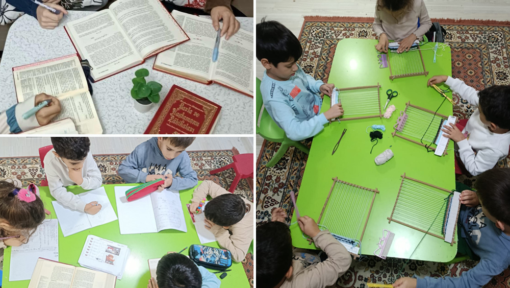 Bizler de çocuklarımızın bu gayretini isteklerini gücümüz yettiği kadar derslerle karşılamaya çalışıyoruz. Hizmetimizin yıllardır her yaş grubu için ayrı ayrı programlanan çocuk derslerimize okulların açılmasıyla tekrar başladık. Umumî ders günlerimizde dershaneye gelen çocuklara Kur’ân-ı Kerîm okutma ve sure talimi ile birlikte ödevlerine yardımcı olma desteği sağlanmaktadır. Cuma akşamları üç grup olarak planlanan derslerimizde ilkokul grubuna Risale-i Nur dersi ile atık materyallerden oyunlar hazırlama, taş boyama, kavanoz boyama, halı dokuma gibi elişi etkinlikleri yaptırıyoruz. Özel okuma saati ve ikram saatimiz oluyor. Ayrıca ayda bir Cumartesi günü ilkokul grubuna bir günlük okuma programı yapılmaktadır.