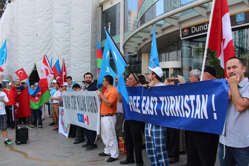 Toronto'nun merkezindeki Dundas Meydanında toplanan 200 kadar Suriyeli Türkmen, Azeri, Türkiye ve Irak Türk'ünden oluşan bir grup, açtıkları pankartlar ve attıkları sloganlarla Çin’in baskıcı politikalarını protesto etti.