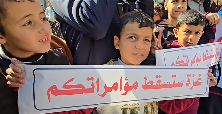 Aralarında çocukların da bulunduğu çok sayıda Filistinli, ellerinde "Filistin bizim, Gazze bizim, bu topraklar bizim, hiçbir yere gitmiyoruz, topraklarımızı terk etmeyeceğiz, Gazze planlarınızı yıkacak, bu topraklar yalnızca halkını kucaklar" yazılı pankartlar taşıdı.
