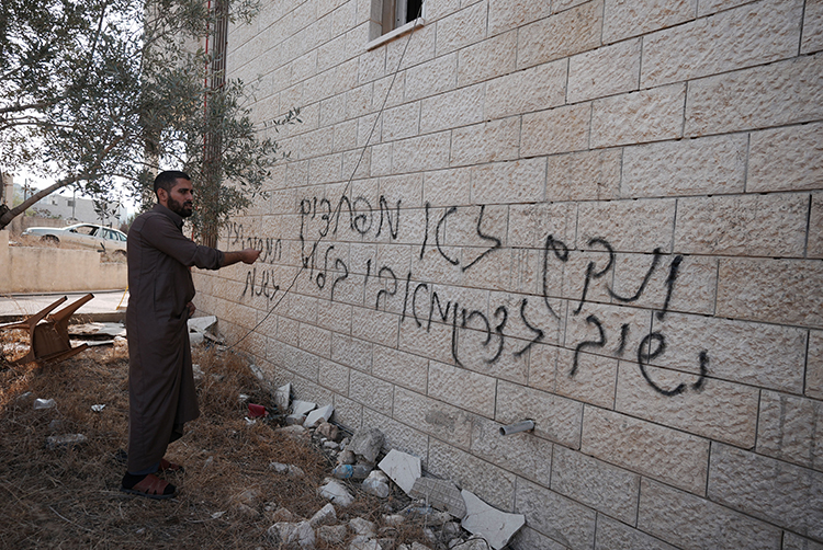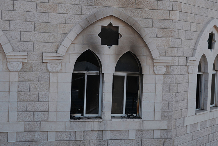 Beldedeki el-Hacce Hamide Camisi'ni ateşe veren saldırgan İsrailliler, caminin duvarlarına ırkçı yazılar yazdı.