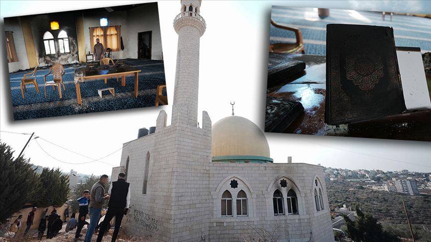 Filistin topraklarını gasbeden İsrailliler, işgal altındaki Batı Şeria'nın Selfit kentinde bir camiyi kundakladı ve duvarlarına ırkçı yazılar yazdı.