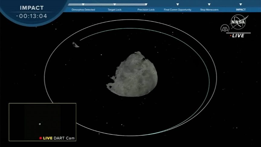 NASA'nın internet sitesinden ve tüm sosyal medya hesaplarından gerçekleştirilen canlı yayında, dünyanın potansiyel asteroit veya kuyruklu yıldız tehlikelerine karşı savunma teknolojisini test etmek amacıyla uzaya fırlatılan DART, dünya için hiçbir tehdit oluşturmayan Dimorphos isimli asteroide tam zamanında çarptı.