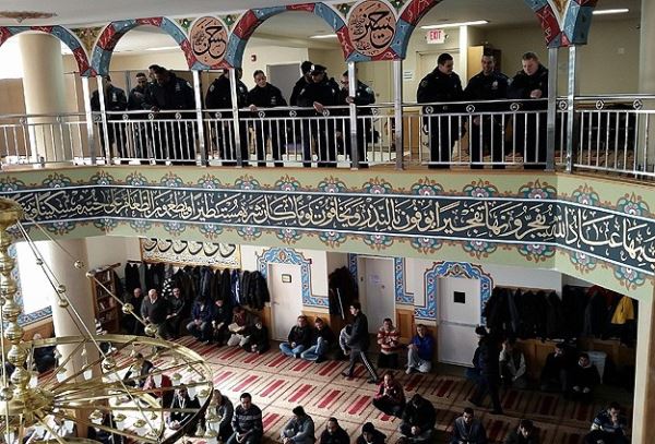Hutbe ve vaazı caminin ikinci katında kendileri için ayrılan bölümde dinleyen polisler daha sonra namaz ve diğer Müslüman ibadetleri konusunda bilgiler aldı.