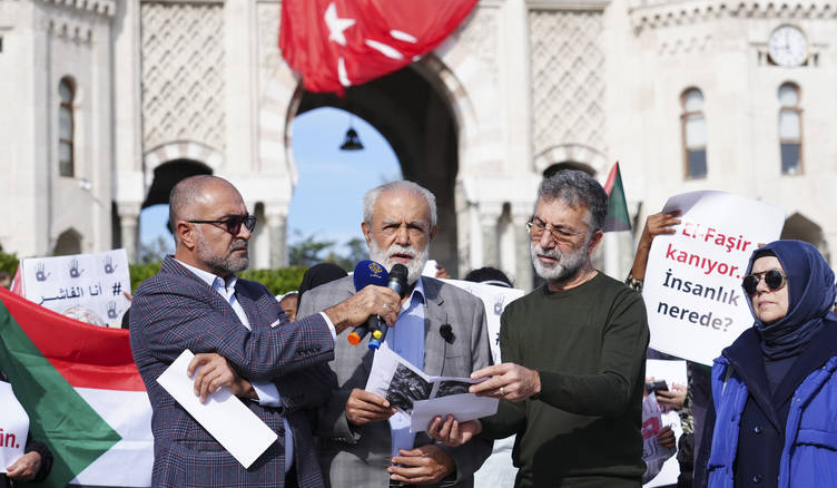İstanbul Fatih’teki Beyazıt Meydanı’nda toplanan grup, ellerindeki Sudan bayrakları ve pankartlar açarken, grup adına basın açıklamasını, Sudan topluluğu başkanı Nazar Ali yaptı.