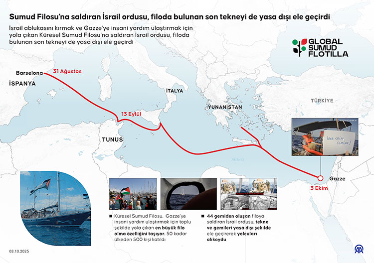 İsrail ablukasını kırmak ve Gazze'ye insani yardım ulaştırmak için yola çıkan Küresel Sumud Filosu'na saldıran İsrail ordusu, filoda bulunan son tekneyi de yasa dışı ele geçirdi.