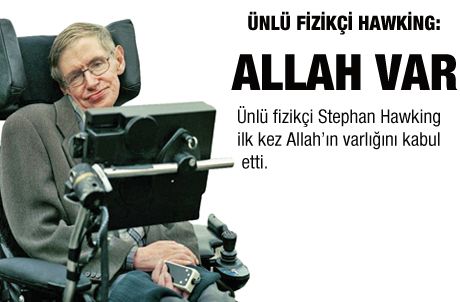 Kanal D Londra Temsilcisi Ayşegül Ekinci’nin röpörtaj yaptığı ünlü Fizikçi Stephen Hawking ilk kez Allah’ın varlığını kabul etti. Röpörtaj sırasında sorulan bir soruya Hawking’in çalışma ekibinin de şaşırdığı görüldü. Yazıları sese dönüştüren bir bilgisayar yardımıyla konuşan ve yıllardır Allah’ın varlığını inkâr eden açıklamalarıyla tanınan Hawking, “Tanrı” ile ilgili sorulan soruya “Evrenin oluşumu bilimin gerçekliğine dayanır. Ama bu hiçbir şekilde, Bilim Kuralları’nı koyan ve onları da yaratan bir Tanrı olmadığı anlamına gelmez...” cevabını verdi. 8 Ocak’ta 71 yaşına giren Hawking’in bu sözlerinin son yıllarda ortaya çıkan Evrim Teorisi’nin yanlış olduğunun ispatlanması ve Kur’ân’da 1400 yıl önce bildirilen bilimsel konuların aynen bulunması ile doğrudan ilgisi olduğu değerlendirmesi yapılıyor.