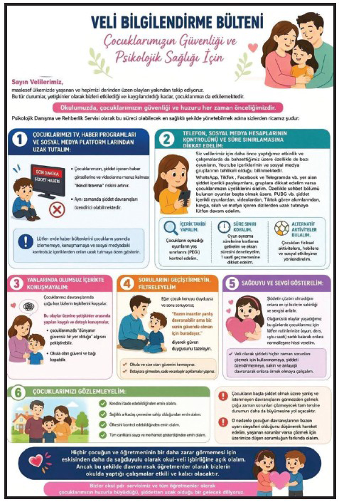 İstanbul İl Millî Eğitim Müdürlüğü Psikososyal Koruma, Önleme ve Krize Müdahale Hizmetleri birimi tarafından öğretmenlere, öğrencilere ve velilere olmak üzere ayrı ayrı hazırlanan bilgilendirme yazıları okul idarelerine iletildi.
