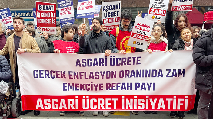 Asgarî Ücret İnisiyatifi üyeleri, “asgarî ücrete gerçek enflasyon oranında zam, emekçiye refah payı” talebiyle İstanbul Şirinevler’de basın açıklaması gerçekleştirdi. Asgarî Ücret İnisiyatifi, “Üreten biziz yöneten de biz olacağız”, “Asgarî değil, insanca yaşam”, “İşçilerin birliği sermayeyi yenecek” sloganları attı. İnisiyatiften Hebun Sümbül, asgarî ücretin insan onuruna yaraşır bir düzeye çıkartılması gerektiğini belirterek, “Emekçinin hakkını sahipsiz bırakmayacağız. Gerçeklikten uzak, tutmayan enflasyon hedeflerine göre yapılacak ücret artışları, gelir adaletsizliğini derinleştirmekten ve halkı daha da yoksullaştırmaktan başka bir sonuç vermeyecektir” dedi.