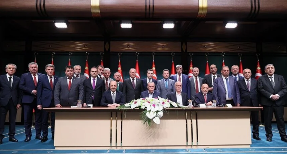Cumhurbaşkanı Recep Tayyip Erdoğan, Cumhurbaşkanlığı Sarayı'nda düzenlenen 2023 yılı Kamu Toplu İş Sözleşmeleri Çerçeve Anlaşma Protokolü imza töreninde konuştu. İmza törenine, Çalışma ve Sosyal Güvenlik Bakanı Vedat Bilgin, TÜRK-İŞ Genel Başkanı Ergün Atalay ve HAK-İŞ Genel Başkanı Mahmut Arslan katıldı. Erdoğan, kamu işçilerinin ücretlerine refah payı dahil yüzde 45 zam yapıldığını, böylece en düşük kamu işçisi ücretinin 15 bin liraya çıkarıldığını bildirdi.