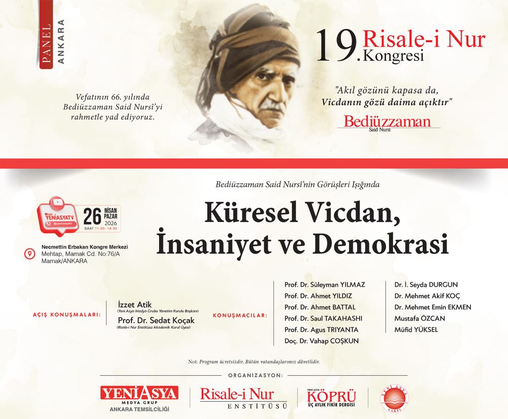 Daha fazlasının konuşulacağı 19. Risale-i Nur Kongresi 26 Nisan’da Ankara, Saat 11.30-16.30 saatleri arasında Necmettin Erbakan Kongre merkezinde gerçekleştirilecektir. Tüm halkımız davetlidir.