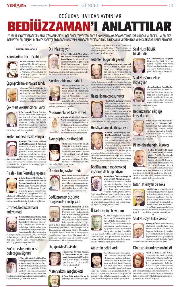 23 Mart 1960’ta vefat eden Büyük İslam Alimi ve Mütefekkiri Bediüzzaman Said Nursî, fikirleri ve eserleriyle konuşulmaya devam ediyor. Farklı dönemlerde âlimler, akademisyenler, düşünürler ve siyasetçiler tarafından yapılan değerlendirmelerin bir kısmını, vefatının 66. yılında tekrar hatırlatıyoruz.