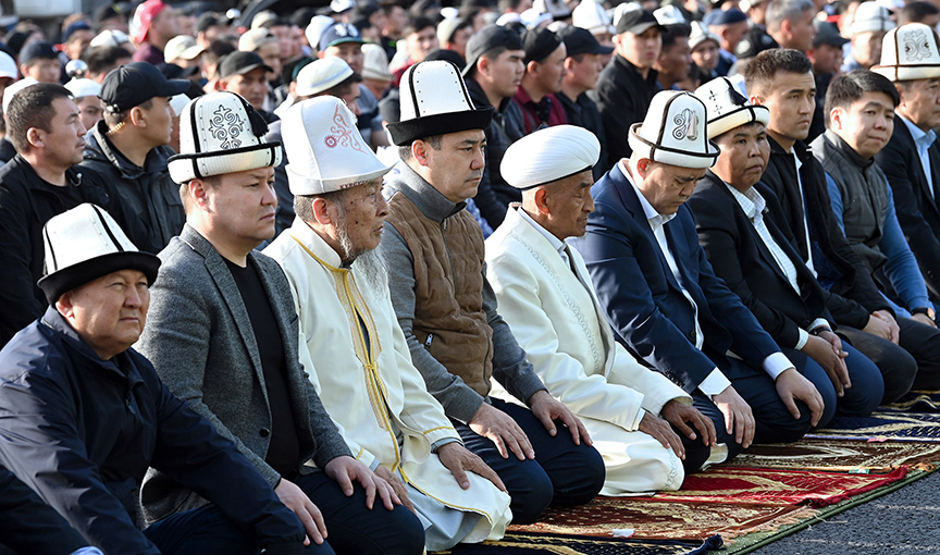 Cumhurbaşkanı Sadır Caparov, Meclis Başkanı Talant Mamıtov, Milli Güvenlik Devlet Komitesi Başkanı Kamçıbek Taşiyev de cemaatle saf tuttu.