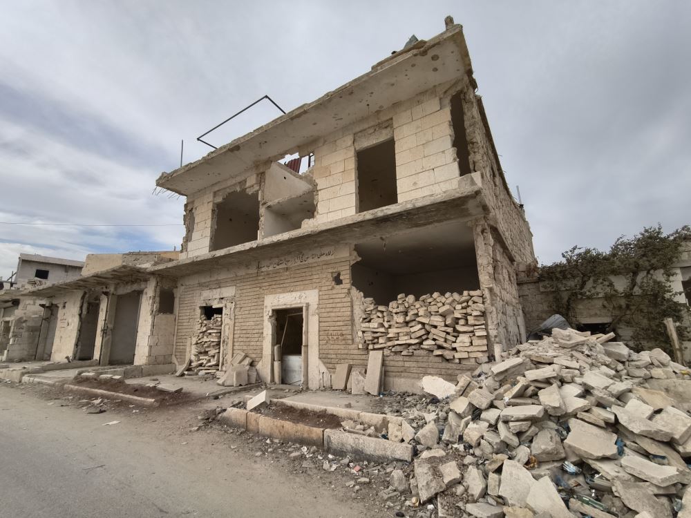 Kardeşlerimizle şehrin merkezinde bir tur attık. Geniş caddelerden geçerken her iki yan tarafta kimisinin yarısı yıkılmış, kimisi binalar da büyük enkaz yığını haline gelmiş olduğu göze çarpıyordu. Arkadaşlarımızın anlattığına göre silahlı muhalif güçlerin bir kısmı bu binalara sığınınca, bu yapılar rejimin güçlerin tarafından uçaklardan atılan füze ve bombalarla tahrip edilmiş. Enkazların hâlâ olduğu gibi durduğunu ve kaldırılmayı beklediğini gördük.