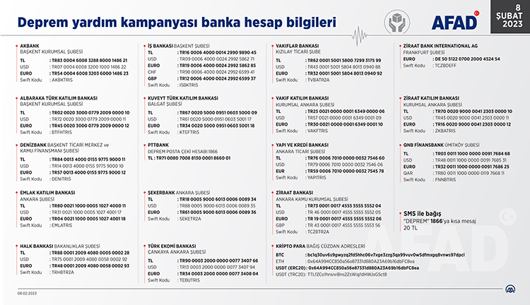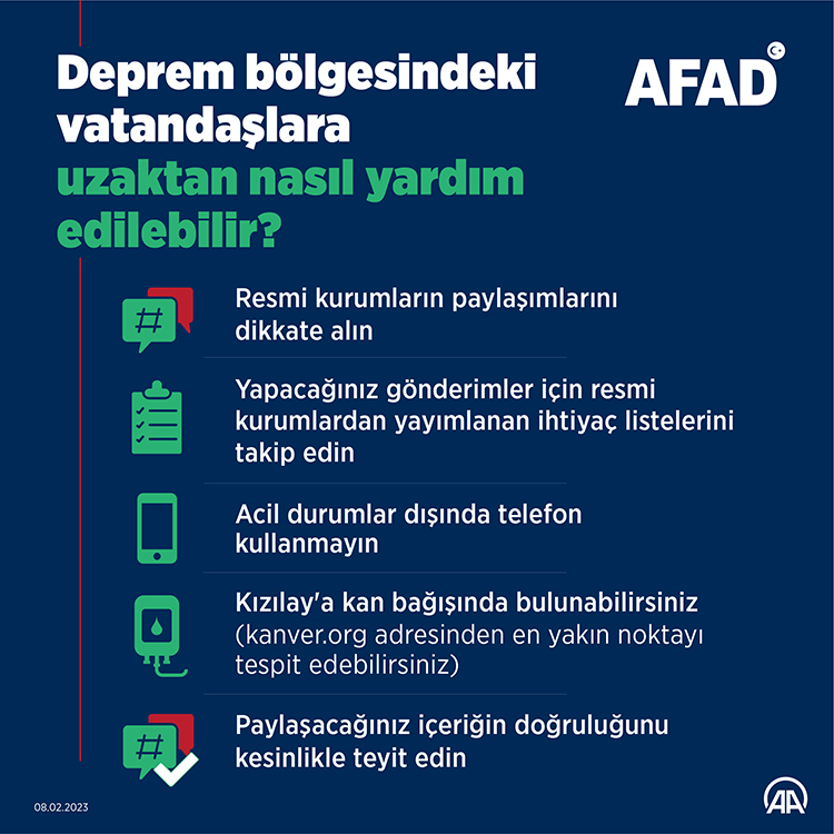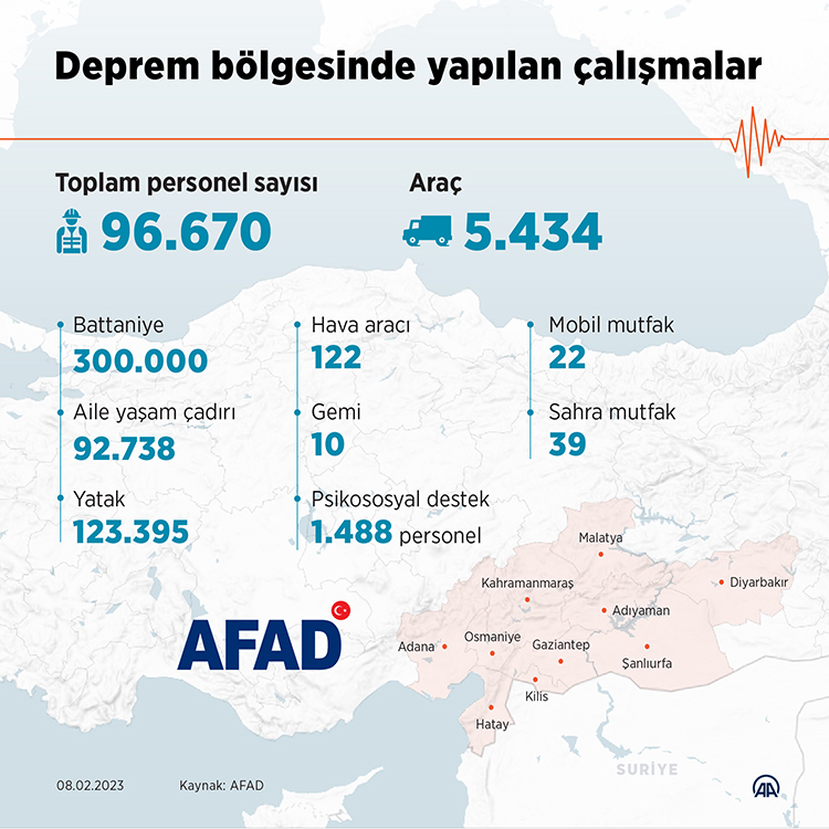 "Bölgede AFAD, PAK, Jandarma, DAK, Milli Savunma Bakanlığı, UMKE, İtfaiye, Milli Eğitim Bakanlığı, Güven, STK ve Gönüllüler, Güvenlik, Yerel Destek Ekipleri'nden görevlendirilen personel ile uluslararası arama kurtarma ekiplerinden oluşan toplam arama ve kurtarma personeli sayısı 79 bin 110'dur. Dışişleri Bakanlığı ile yapılan görüşmeler neticesinde diğer ülkelerden yardım için gelen 5 bin 309 personel afet bölgesine sevk edilmiştir.