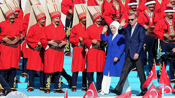Mehteran Grubu’nun ‘Devlet Marşı’yla alana giriş yapan Erdoğan halkı selamlarken sık sık, “İslam coğrafyasının umudu, Balkanlarda Evlad-ı Fatihan, İşte Recep Tayyip Erdoğan” anonsu yapıldı. Alana 4 bin 500 metrekarelik dünyanın en büyük 3 boyutlu sahnesi kuruldu. 563 kişilik Cumhurbaşkanlığı Muhafız Alayı ve TSK Mehteran Birliği, Mehteran Grubu sahne aldı. Ayrıca güvenlik içi 9 bin polis, 5 helikopter, 1 denizaltı, 1 fırkateyn, 3 sahil güvenlik teknesi, 27 polis köpeği hazır bulundu.