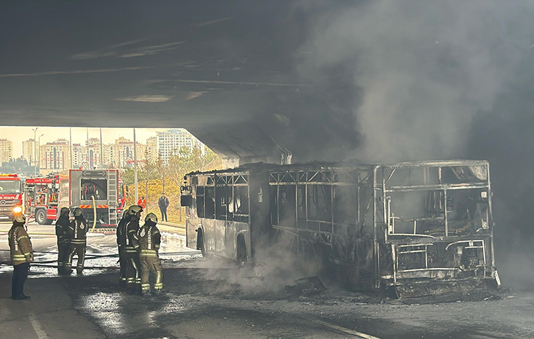 İstanbul'un Başakşehir ilçesinde içinde yolcuların bulunduğu İETT otobüsü, seyir halindeyken çıkan yangın sonucu kullanılamaz hale geldi.