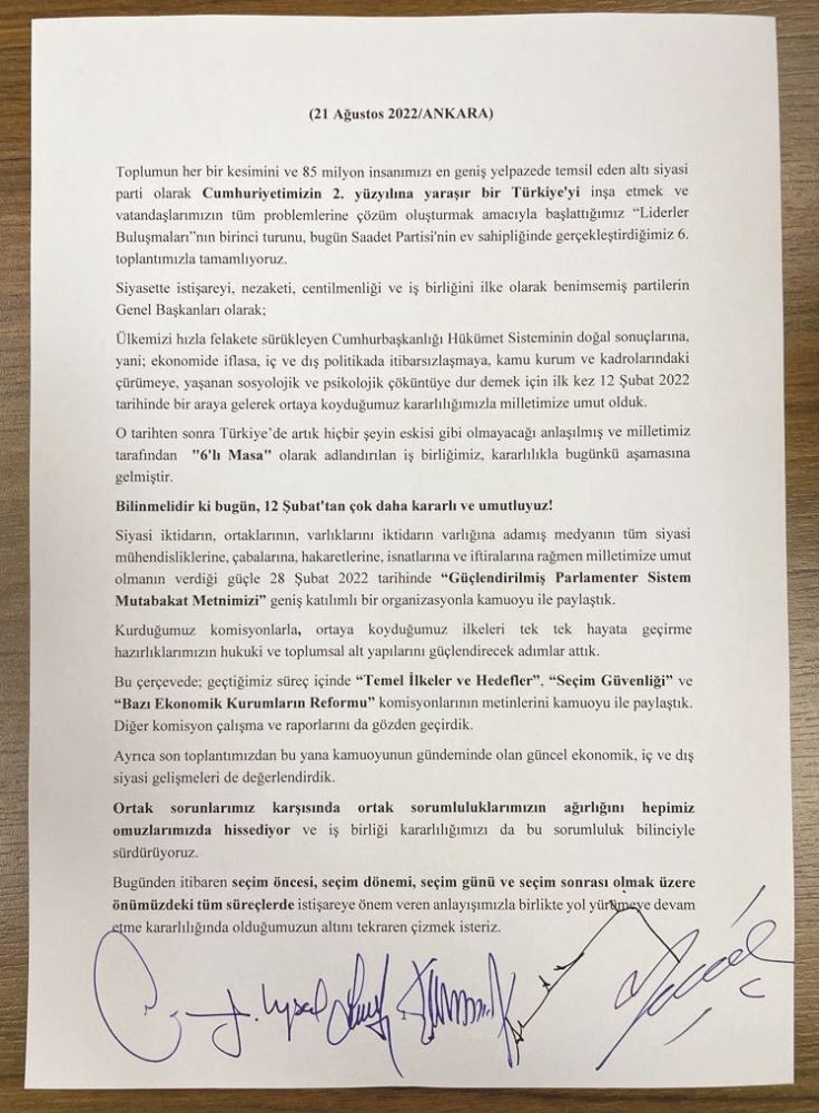 CHP Genel Başkanı Kemal Kılıçdaroğlu, Saadet Partisi Genel Başkanı Temel Karamollaoğlu, İYİ Parti Genel Başkanı Meral Akşener, Demokrat Parti Genel Başkanı Gültekin Uysal, Gelecek Partisi Genel Başkanı Ahmet Davutoğlu ve DEVA Partisi Genel Başkanı Ali Babacan; iki sayfalık ortak açıklamaya imza attı.