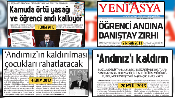 Danıştay’ın, 8 Ekim 2013’te kaldırılan ‘Öğrenci Andı’ için ‘yeniden okutulsun’ şeklinde bir karar alması ‘Kemalist vesayetin hortlatılması’ olarak yorumlanırken, farklı kesimlerdeki kişilerin tepkisine yol açtı. Milliyetçi, Ulusalcı ve Kemalist çevrelerden destek gören karara, demokrat ve muhafazakar çevreler tepkili. Yeni Asya Gazetesi olarak, 2011’de artan ve 2013’te ‘Öğrenci Andı’nın kaldırılmasına giden süreçte yapılan tartışmalar da manşetlerimize ve haberlerimize şu şekilde yansımıştı; 2 Nisan 2011’de “Öğrenci andına Danıştay zırhı’ manşetiyle gündeme taşıdığımız haberle yapılan uygulamaya karşı çıkılmıştı. 20 Eylül 2013’de ‘Andınız’ı kaldırın’ manşetiyle öğrencilere zorla okutulan and metnine tepki gösterilmişti. 9 Ekim 2013’te “Öğrenci andı tamam sıra diğer yeminlerde” manşetiyle ‘Öğrenci Andı’nın kaldırılması haberleştirilmişti.
