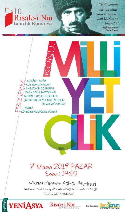 Hanımlar ve erkekler olarak ayrı yapılacak Masa Çalışmaları’nın ortak sonuç bildirileri 7 Nisan’da Nazım Hikmet Kültür Merkezi’nde gerçekleştirilecek olan 10. Risale-i Nur Gençlik Kongresi’nde kamuoyuyla paylaşılacak. Pazar günkü program Kur’an-ı Kerim tilavetiyle başlayacak. Ardından açış konuşmaları, milliyetçilik konusunda sinevizyon gösterimi yapılacak. Mehmet Akça’nın ilahileriyle devam edecek programda gazetemizin Yazı İşleri Müdürü İbrahim Özdabak, “Çizgilerin Diliyle Milliyetçilik” konulu bir gösteri gerçekleştirecek.