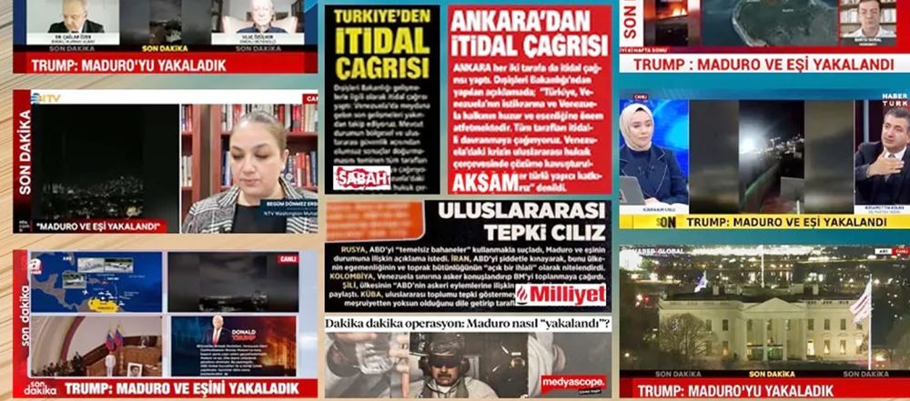 Bildirici “Dikkat ettim, 3 Ocak günü haber kanallarının sunucularının dilinde, ekranların altında hep “Maduro yakalandı” cümlesi vardı. Dijital mecralarda da “yakalandı” sözcüğü sık kullanılıyordu. Oysa “yakalamak”, Trump’ın açıklamasında kullandığı sözcüktü; onun bakışını yansıtıyordu. Bir ülkenin başka bir ülkenin devlet başkanını askerî operasyonla ülkesinden kaçırmasını, “yakalamak” olarak nitelendirmek, olayı bir çete liderinin yakalanmasına indirgemektir; daha beteri Trump’ın diline teslim olmaktır. Tabii teslimiyet, Trump’ın diliyle de sınırlı değildi. İktidara da teslim olan yaygın medya Cumhurbaşkanı Erdoğan’ın, gün boyu Venezuela’ya müdahaleye ilişkin sessiz kalmasını da göstermemeye çalıştı. “Bir yanda kınama bir yanda itidal” diyen Hürriyet, “Uluslararası tepkiler cılız” yazan Milliyet, Dışişleri Bakanlığı’nın saldırıyı kınayamayan açıklamasının da “cılız” olduğundan söz edemedi, geçiştirdi” diye yazdı.