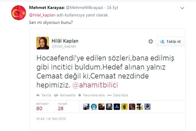 Kaplan, 14 Temmuz 2013 günü “Hocaefendi’ye edilen sözleri bana edilmiş gibi incitici buldum. Hedef alınan sadece cemaat değil ki, cemaat nezdinde hepimiz” şeklinde mesaj paylaşmıştı.