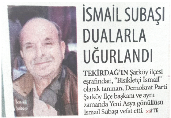 İsmail Subaşı kardeşimiz, 22 Mart Cumartesi günü saat 11.30’da ani bir kalp krizi neticesinde vefat etti. Ertesi gün öğle namazından sonra Tekirdağ, Çorlu, Malkara, Kırklareli, Lüleburgaz’dan ve ilçe merkezi ile civar köylerden gelen kalabalık bir cemaatle cenaze namazını kıldık. Allah rahmet eylesin, taksiratını affetsin, mekânı Cennet olsun.