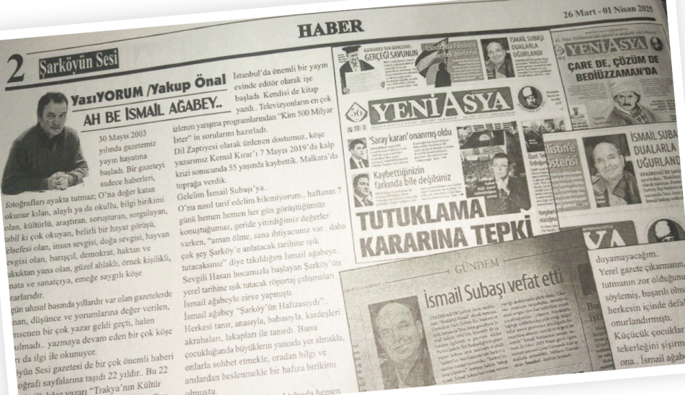 Bu arada, yazarlık yaptığı ve gazete sahibi Yakup Önal Bey’le arası çok iyiydi. Sık sık görüşüyorlardı. Allah kendisinden razı olsun. Çıkarmış olduğu Şarköy’ün Sesi gazetesinde onun vefat haberini hem birinci sayfada, hem de ikinci sayfada tam sayfa yorumla yayınladı. Bize ve arkadaşlara vermek üzere fazla gazete getirdi.