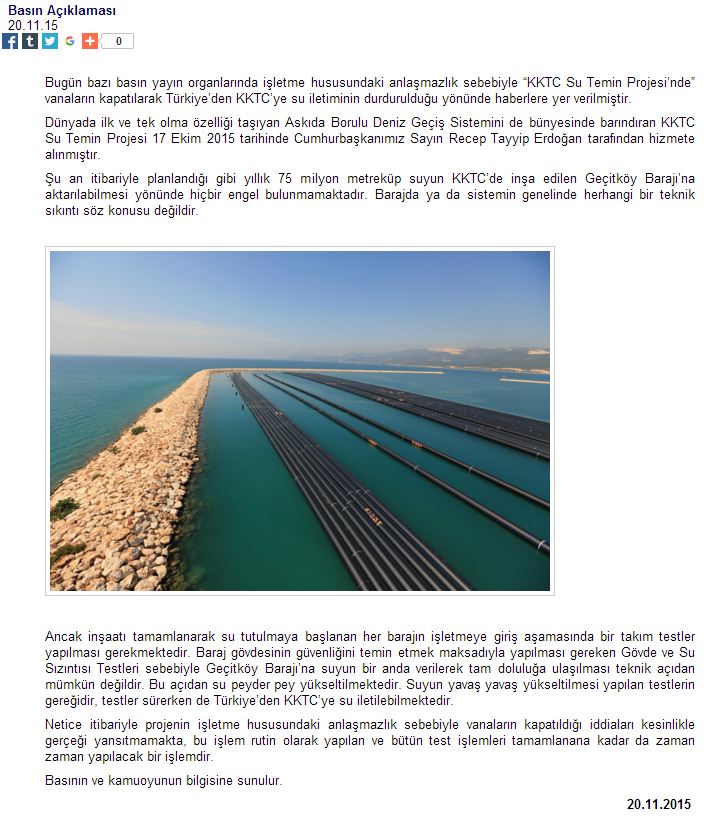 Cumhurbaşkanı Erdoğan ile KKTC Cumhurbaşkanı'nın katılımı ile 1 Kasım'dan bir gün önce açılan ve asrın projesi denilen Türkiye'den KKTC'ye su taşıyan sistem kapatıldı.