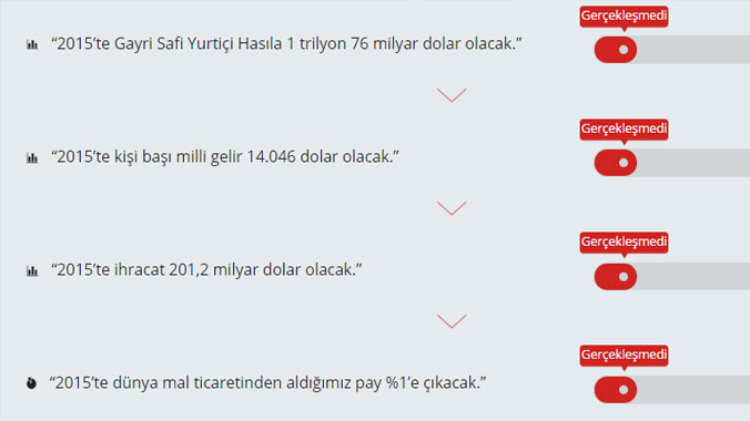 Gayri Safi Yurtiçi Hâsılanın 2015’te 1 trilyon 76 milyar dolar olacağı vaadi gerçekleşmedi, GSYH 800 milyar 107 milyon dolarda kaldı. Kişi başı gelirin 14.046 olacağı vaat edilmişti, fakat TUİK verilerine göre son 3 senede milli gelirde binde 3’lük azalma oldu, kişi başı gelir 10 bin 428 dolarda kaldı.