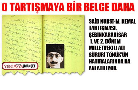 vi. Bu tartışmanın gün yüzüne çıkan ve belki de en ikna edici şahidi ise Şebinkarahisar Mebusu Ali Süruri Tönük�tür. I. ve II. Dönem Şebinkarahisar milletvekilliği ve TBMM başkan vekilliği yapan Ali Süruri19 hatıralarında Bediüzzaman-M. Kemal tartışması ile ilgili şunları söylemektedir (25 Kasım 1922): �Takrîben akşam namâzı sıralarında Meclis dağılırken baktım, Dîvan-ı Riyaset Odasında Kemal Paşa ile Bediüzzaman Molla Saîd-i Kürdî arasında bir mübâhase var. Ben de dinledim. Bir saat kadar imtidad etti. Mübâhasenin ibtidâsı; Bedîüzzamân�ın Kemâl Paşa�ya ve dahâ ba�zı arkadaşlara yazdığı mektubda, namaz kılmalarını tavsiye etmesinden� Kemâl Paşa, meâl-i mektûbun siyâsete derkâr olan mahâzîrinden ve hiç olmazsa yalnız kendisine yazılsa idi bu mahzûrun o kadar vârid olmayacağından bahisle Bedîüzzamân�a darıldı. Bedîüzzaman da bu mahzûru düşünemediğini i�tirâf etdi. Bedîüzzamân da, evvelce biraz haşînce söylüyor idiyse de sonra te�vil ve tehaffüf etdi. Ve aralarındaki kırgınlık zâhiren zâil oldu gibi ise de herhâlde iki taraf da birbirine muğber kaldılar zan ederim.� 20