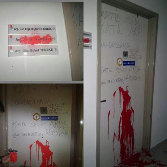 Haber10'un haberine göre kendilerine "Öğrenci Kolektifleri" ismini veren marjinal sol örgüt üyeleri, Hacettepe Üniversitesi'nde araştırma görevlisi olan Arda Akçiçek'in kapısını kan rengi olan kırmızıya boyayarak tehdit etti.