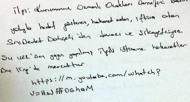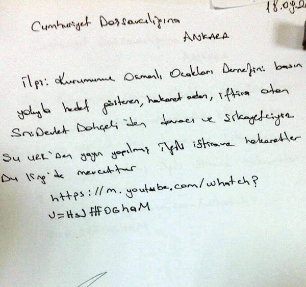 Hürriyet gazetesinden Mesut Hasan Benli'nin haberine göre, savcılığın geri çevirdiği dilekçede sadece, “İlgi: Kurumumuz Osmanlı Ocakları Derneği’ni basın yoluyla hedef gösteren hakaret eden, iftira eden Sn: DEVLET BAHÇELİ’den davacı ve şikâyetçiyiz Şu URL’den yayın yapılmış ilgili iftira ve hakaretler bu ling’de mevcuttur” ifadeleri yer aldı. Elyazısıyla yazılan metnin altında da “https://m.bir youtube.com//whatch?” adresi yazıldı. Savcılık, dilekçenin daha düzgün bir şekilde hazırlanmasını istedi.
