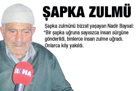 Bitlis`in Mutki (Motkan) ilçesine bağlı Kayran (Hersan) Köyünün Çerho mezrasında dünyaya gelen Nadir Baysal (88), “Şapka Kanunu”nu anlattı. Şapka kanunu çıktıktan 13 yıl sonra köyleri yıkılan Baysal, Kastamonu`ya sürgün edildi. Kastamonu’da Bediüzzaman Said Nursî ile tanışan Baysal, 4 yıl Bediüzzaman’ın hizmetinde bulundu.