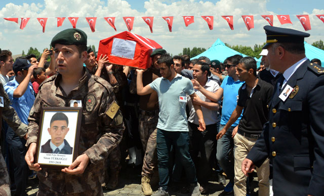 Hakkari'nin Şemdinli ilçesinde 4 Haziran’da PKK’lı teröristlerin karakola roketatarlı saldırısında ağır yaralanıp, tedavi gördüğü hastanede 7 gün sonra şehit olan özel harekat polisi Sinan Türkoğlu (25), memleketi Kahramanmaraş’ın Elbistan ilçesinde törenle toprağa verildi.