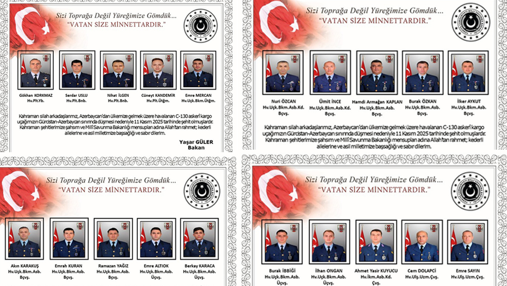 - Milli Savunma Bakanı Yaşar Güler, taziye mesajında, “Kahraman silah arkadaşlarımız, Azerbaycan’dan ülkemize gelmek üzere havalanan C130 askerî kargo uçağımızın Gürcistan-Azerbaycan sınırında düşmesi nedeniyle 11 Kasım 2025 tarihinde şehit olmuşlardır. Kahraman şehitlerimize şahsım ve Milli Savunma Bakanlığı mensupları adına Allah’tan rahmet, kederli ailelerine ve asil milletimize başsağlığı ve sabır dilerim.” ifadelerini kullandı.