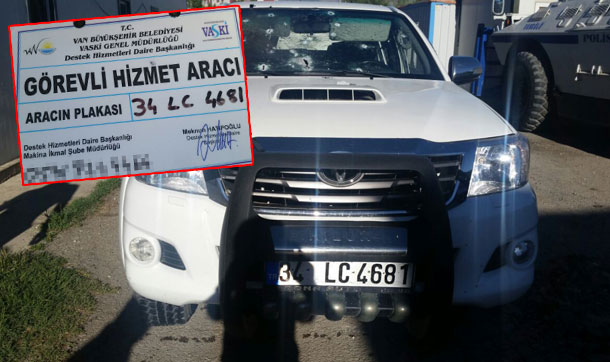 Aracın ön camındaki kartta yazan Van Büyükşehir Belediyesi, VASKİ Genel Müdürlüğü Destek Hizmetleri Daire Başkanlığı, Görevli Hizmet Aracı yazısı dikkat çekti. Sağ olarak yakalanan teröristin de belediye personeli olduğu öğrenildi.
