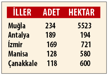 Geçen yıl en çok orman yangını görülen il Muğla oldu. Bu ilde 234 yangın çıkarken 5 bin 523 hektar alan zarar gördü. Muğla’yı, 189 orman yangını ile Antalya, 169 ile İzmir, 128 ile Manisa ve 118 ile Çanakkale takip etti. Söz konusu dönemde Yalova, Kırşehir, Ağrı, Iğdır, Malatya ve Muş’ta ise orman yangının çıkmadığı kaydedildi. Öte yandan Çanakkale'de hafta başında çıkan ve birçok köyü etkisi altına alan orman yangınında 10 dönüm ağaçlık alan zarar gördü. Bölgede bir süre soğutma çalışması yapıldı.