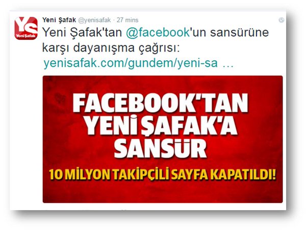 Hükümete yakınlığıyla bilinen gazete, Facebook’un Türkçe, Arapça ve spor sayfalarını ‘bir gerekçe sunmadan’ kapattığını ileri sürüp ‘görülmemiş bir sansür’ ifadesini kullanmış, ancak gazete ‘beğeni’ sayısını artırmak için alakasız birçok sayfayı satın aldığı için sayfasının kapatıldığı ortaya çıkmıştı.