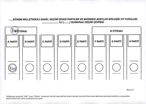Örnek Şablon 11; İttifak alanı içerisinde “EVET” veya “TERCİH” mührünün hem bir siyasi partiye ayrılan alanlara hem de ittifak unvanı bölümüne basılması halinde bu oy pusulaları geçerli kabul edilir ve bu oy (A) partisine sayılır.