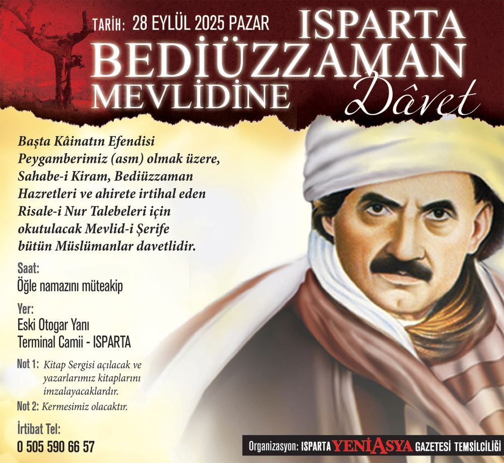 28 Eylül 2025 Pazar Günü Bediüzzaman Mevlid-i Şerifi okutulacak. Her türlü tedbirler alınmış ve bunun için Ispartalı kardeşlerimiz seferber olmuşlardır.