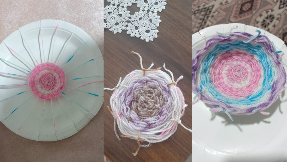 Yapılışı: Plastik tabağın kenarlarına kesikler atıyoruz. Tabağın arka kısmının ortasına ipin bir ucunu bantlıyoruz daha sonra kestiğimiz kenarlardan ipi karşılıklı gelecek şekilde çeviriyoruz. Tekrar arka noktada birleştirip bu kez bağlıyoruz. Başka bir ipin ucunu tabağımızın orta kısmındaki üst üste gelmiş olan orta noktada bağlayıp iplerin arasından bir alttan bir üstten geçirerek çember şeklinde dönüyoruz. Aman dikkat! Çemberimiz büyüdükçe biraz gevşeterek gitmeliyiz. Çok sıkı yaparsak tabak kasılıyor. İstediğimiz boyuta geldiğinde ipleri kesip birbirlerine bağlıyoruz. İster duvar süsü ister bardak altı süsü olarak kullanabilirisiniz. Bunun sizlere kazanımı; hem ince motor gelişiminize yarayacak hem de dikkat dağınıklığınıza bir çözüm önerisi olacaktır.