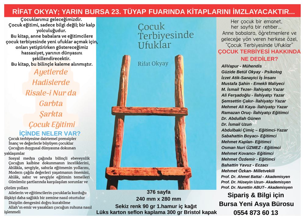 Fuarda yazarlarımız da kitaplarını imzalayıp okuyucularıyla sohbet edecekler. Tarihçi yazar Rifat Okyay 12 Nisan Pazar günü (yarın) kitaplarını imzalayacak, ardından da “Osmanlı Devletinin Kuruluşunda Bursa ve Fetihler” konulu söyleşide bulunacak. 18 Nisan Pazar günü ise edebiyatçı-yazar İslâm Yaşar okuyucularıyla buluşacak ve ayrıca “Çağımızın Tefsiri Risale-i Nur” konulu bir konuşma yapacak.