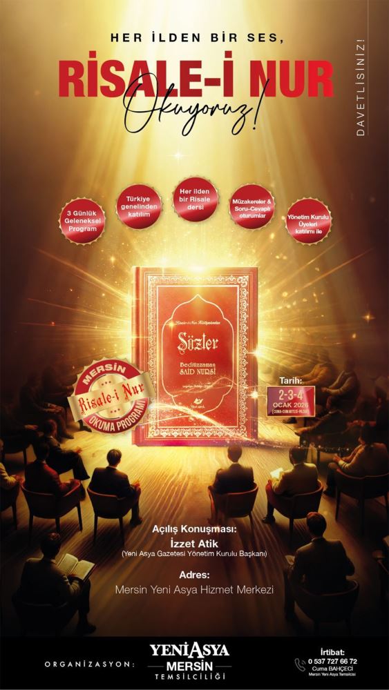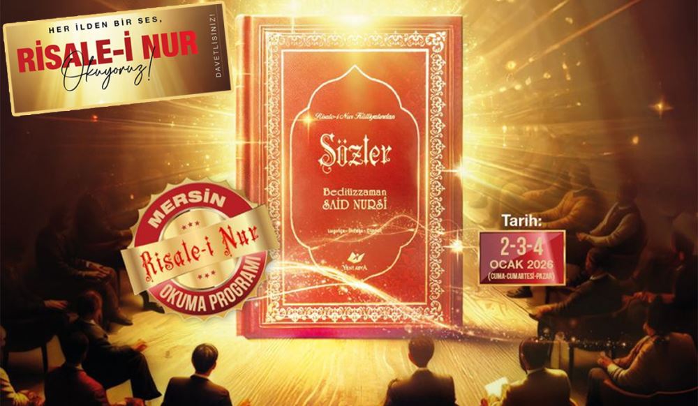 Geleneksel “Her ilden bir ses Risale-i Nur okuyor” programı, 2–3–4 Ocak tarihlerinde Mersin Yeni Asya Hizmet Merkezi’nde yapılacak.