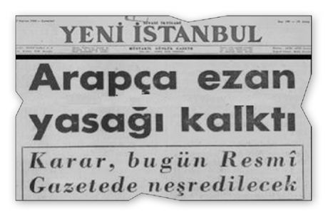 Hükümet programının TBMM’de okunmasından on sekiz gün sonra, 16 Haziran 1950’de, ezanın Türkiye’de Türkçe okunacağını düzenleyen yasa hükmü kaldırıldı. Söz konusu yasaya ilişkin tasarı, Menderes Hükümeti’nin TBMM’ye sunduğu ilk tasarı olması bakımından dikkat çekicidir. Çünkü DP böylece, önceliğinin ne olduğunu ortaya koymuştur.