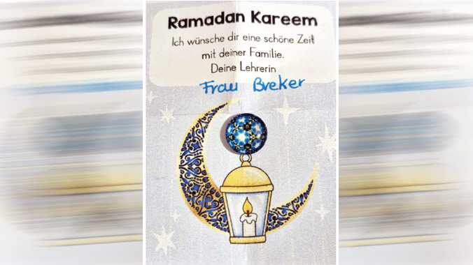Sınıf öğretmeni Breker’ın Müslüman öğrencisine verdiği tebrik kartında şunlar yazıyor: “Ramadan Kareem. Lch wünsche dir eine schöne Zeit mit deiner familie. Deine Lehrerin.”
