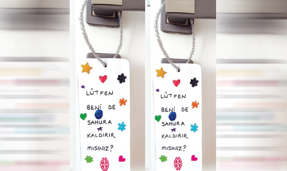 Öncelikle kâğıt ya da kartonumuzu dikdörtgen şeklinde kesiyoruz. Daha sonra kestiğimiz dikdörtgen kâğıdımızın ortasına "Lütfen beni de sahura kaldırır mısınız?" notunu yazalım. Kâğıdımızı istediğimiz şekilde süsleyelim. Çiçekler çizerek ya da sticker yapıştırarak süsleyebiliriz. Delgeç ile ya da sivri uçlu bir eşyamız ile en üst ortasından bir tane delik açalım. Delikten ip ya da şönil geçirip uçlarını bağlayalım. Artık kapımıza sahur için notumuzu asabiliriz. Şimdiden Ramazan-ı Şerifinizi tebrik ediyorum çocuklar. Yepyeni etkinlik fikirleri ile tekrar görüşmek üzere, Allah'a emanet olun.