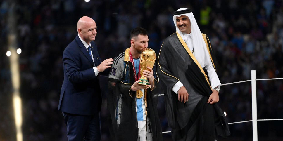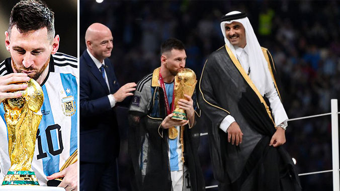 Arjantin'in kaptanı Lionel Messi'ye yerel Arap kıyafeti giydiren Katar Emiri Şeyh Temim bin Hamed Al Sani ile FIFA Başkanı Gianni Infantino, Dünya Kupası'nı yıldız futbolcuya verdi.