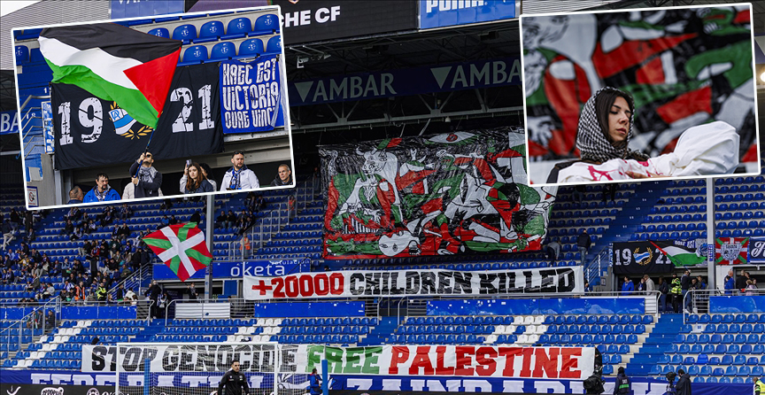 Bask bölgesinin kulüpleri Osasuna, Athletic Bilbao ve Alaves'in taraftarları, tribünleri Filistin bayrakları ve İsrail'i protesto eden pankartlarla doldurdu.